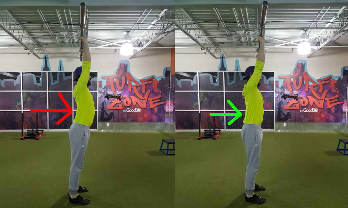 The above photo represents poor (left) and good (right) technique performed on the Standing Barbell Shoulder Press. Hyperextension of the low back (left) repeated over time may beat up on the lumbar facet joints. Correcting hyperextension by maintaining a neutral spine is key in reducing the stress on the lumbar facet joints.