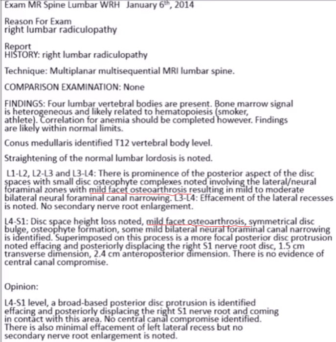 Mainly, prolonged periods of sitting and heavy squatting have been two tasks that have been a bit of a struggle at times. In the photo below is a picture of my MRI report that was taken on January 6th, 2014 which is where I was first initially diagnosed with facet joint osteoarthrosis.