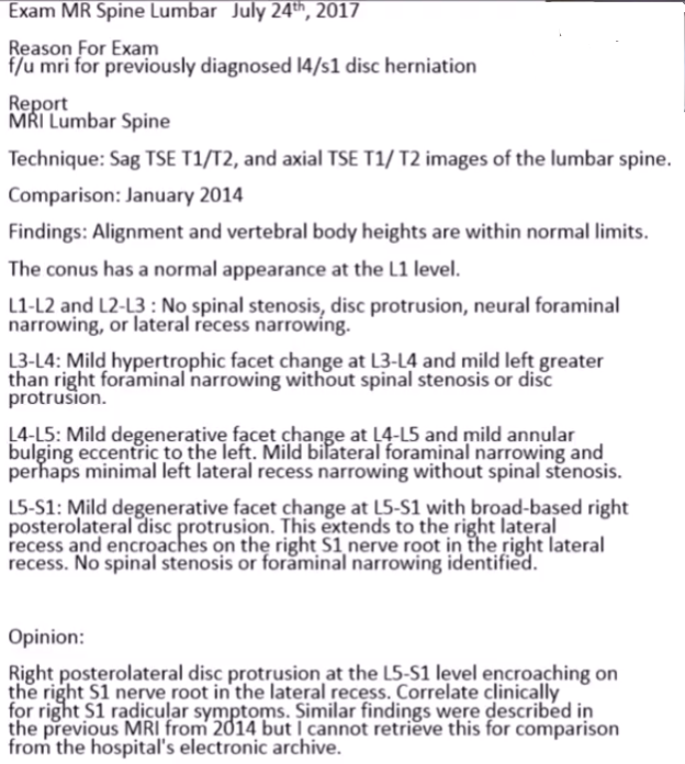 The follow-up MRI report was conducted on July 24th, 2017. This is about 3 and a half years after my initial MRI. Note: This is not a true comparison considering a different radiologist examined my MRI images, and only the previous MRI report (no images) was available for examination by the radiologist.