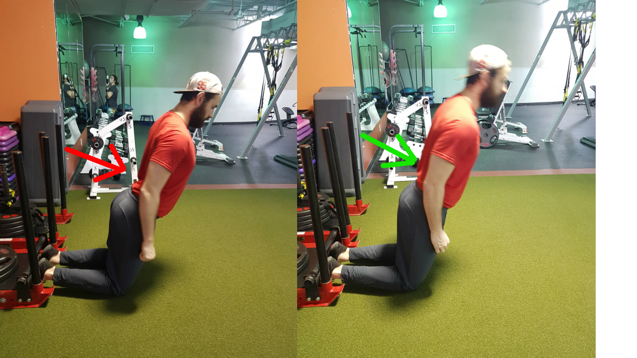 The above photo represents poor (left) and good (right) technique performed on the Nordic Hamstring Curl. Hyperextension of the low back (left) repeated over time may beat up on the lumbar facet joints. Correcting hyperextension by maintaining a neutral spine is key in reducing the stress on the lumbar facet joints.