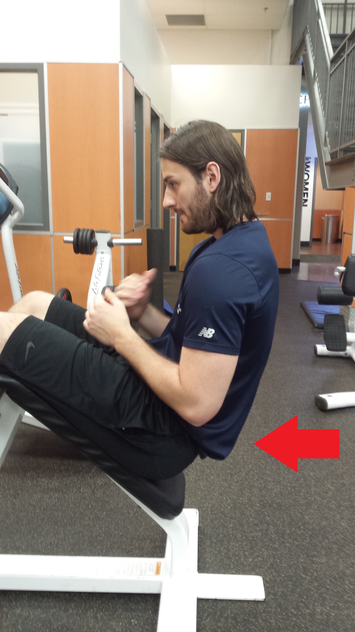 The above photo represents the classic “leg press” exercise. Athletic hockey performance cannot be trained in a seated position and the “leg press” can place high stresses on the low back. This is not a machine/exercise that would be in a hockey players best interest to be performing. The arrow indicates a common technique flaw known as “butt wink” and is commonly seen with folks performing the leg press or squat.